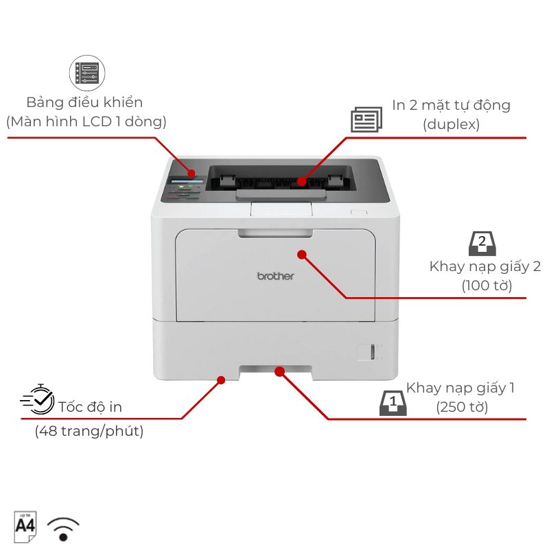 Máy in Brother HL-L5210DN là giải pháp in laser đơn sắc chuyên nghiệp được thiết kế dành riêng cho môi trường văn phòng có nhu cầu in ấn cao. Với tốc độ in ấn tượng 48 trang/phút và công nghệ bảo mật 3 lớp được chứng nhận quốc tế, thiết bị này mang đến hiệu suất vượt trội cùng độ tin cậy cao cho doanh nghiệp. Máy tích hợp đầy đủ tính năng cần thiết từ in 2 mặt tự động đến khả năng mở rộng khay giấy, đáp ứng mọi yêu cầu in ấn chuyên nghiệp.