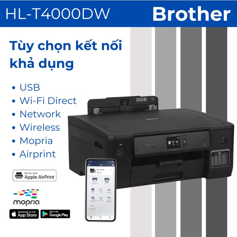 Wi-Fi Direct và AirPrint/Mopria hỗ trợ in từ iOS và Android một cách liền mạch. Ứng dụng Brother Mobile Connect mở rộng khả năng quản lý và điều khiển máy từ xa, phù hợp xu hướng làm việc linh hoạt.