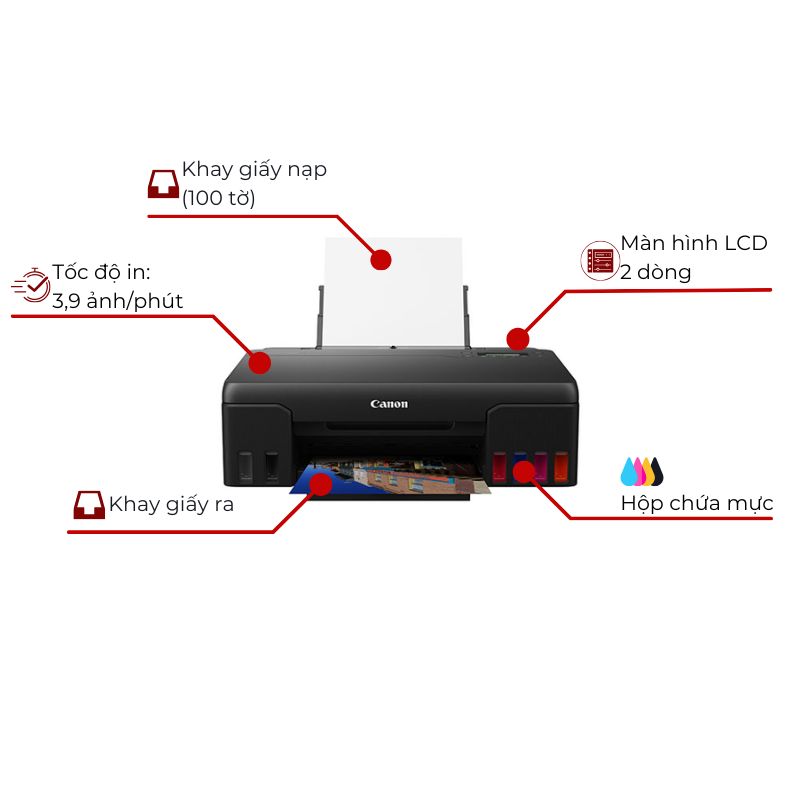 Canon G570 hỗ trợ nhiều khổ giấy từ A4, A5, B5 đến các khổ ảnh chuyên dụng như 4×6″, 5×7″, 8×10″. Khay giấy chứa 100 tờ giúp giảm thiểu việc nạp giấy thường xuyên, phù hợp cho cả công việc văn phòng và in ảnh gia đình.