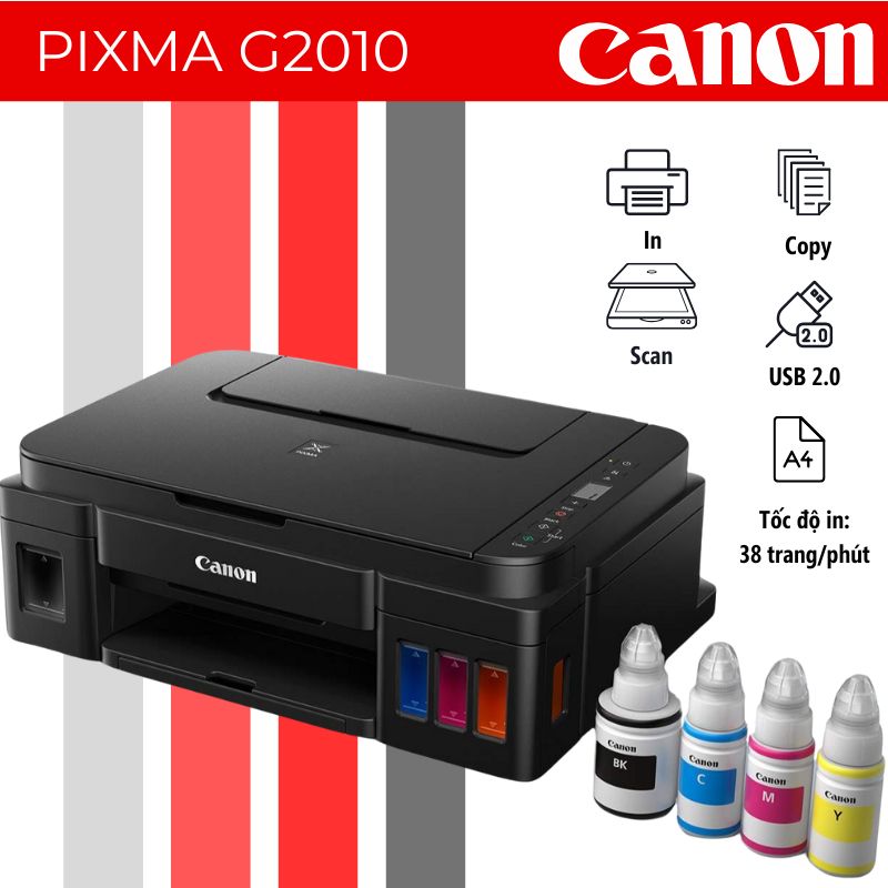 Máy in Canon PIXMA G2010 là giải pháp in ấn đa chức năng hoàn hảo cho gia đình và văn phòng nhỏ với hệ thống mực liên tục tiết kiệm. Thiết bị này kết hợp ba tính năng in, scan và copy trong một máy duy nhất, giúp tiết kiệm không gian làm việc và mang lại chi phí vận hành cực thấp chỉ 50-70 VNĐ mỗi trang đen trắng.